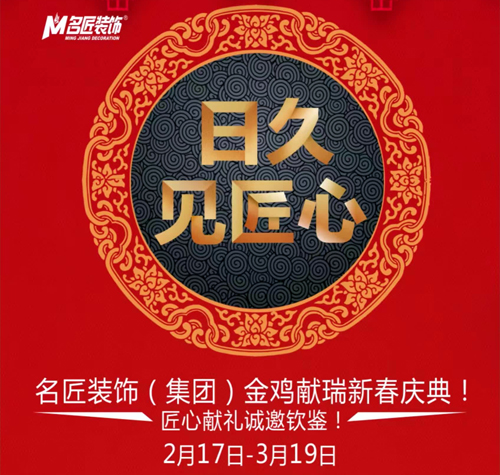 2017年名匠裝飾金雞獻瑞新春慶典,匠心獻禮誠邀欽鑒!2月17日——3月19日全國238城聯(lián)袂獻禮匠心服務!“日久見匠心”活動分為兩個主題——《春天的禮物》、《為愛點亮的小夜燈》。名匠裝飾新春盛宴“日久見匠心”活動感恩回饋一大波鉅惠在等候各位光臨,對于需要裝修的朋友們,如果還沒有想好的話,就來名匠裝飾吧!